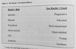 I like to shorthand this the “Good/Bad” binary. Because being associated with racism brings up all sorts of uncomfortable feelings for White people, and makes us feel like we’re associated with those hate mongering wack-jobs and no one wants to feel like that!